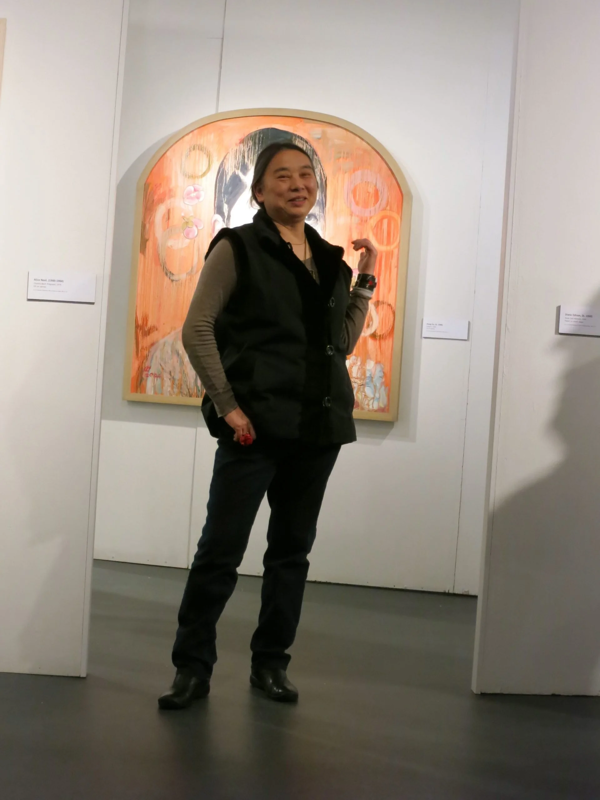 Hung Liu in front of her painting in the “The Female Gaze” exhibition at the Vicki Myhren Gallery, University of Denver, 2014
